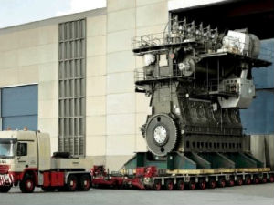 ವಿಶ್ವದ ಬೃಹತ್ ಹಡಗೊಂದಕ್ಕೆ ಅಳವಡಿಸಲು ಇದನ್ನು ಕೊಂಡೊಯ್ಯಲಾಗುತ್ತಿದೆ. ಇದು 2 ಸ್ಟ್ರೋಕ್ ಡೀಸಲ್ ಎಂಜಿನಾಗಿದೆ. Wartsila-Sulzer RTA96-C ಎಂಬ ಈ ಎಂಜಿನ್ 25,480 ಲೀಟರ್ ಸಾಮರ್ಥ್ಯದ್ದಾಗಿದೆ. ಇದು 14 ಸಿಲಿಂಡರ್ರ್ ಹೊಂದಿದೆ. ಇದರ ತೂಕ 2,300 ಟನ್. ಈ ಎಂಜಿನ್ ನಂಬಲು ಅಸಾಧ್ಯವೆಂಬಂತೆ 1.09 ಲಕ್ಷ ಹಾರ್ಸ್ ಪವರ್ ನೀಡುತ್ತದೆ. ಚಿತ್ರವನ್ನೊಮ್ಮೆ ನೋಡಿ, 68 ಚಕ್ರದ ಲಾರಿಯ ಮೇಲಿದೆ ಈ ಬೃಹತ್ ಎಂಜಿನ್.