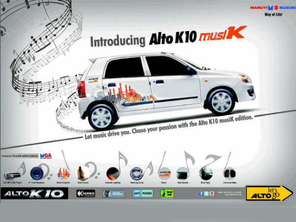 ದೇಶದಲ್ಲಿ ಅತ್ಯಂತ ಹೆಚ್ಚು ಮಾರಾಟಗೊಂಡಿರುವ ಕಾರೆಂಬ ಬಿರುದು ಪಡೆದುಕೊಂಡಿರುವ ಆಲ್ಟೊ, ಜನಸಾಮಾನ್ಯರ ನೆಚ್ಚಿನ ಕಾರೆನಿಸಿಕೊಂಡಿದೆ. ಈ ನಿಟ್ಟಿನಲ್ಲಿ ಮಾರುತಿಯ ಹೊಸ ಉಡುಗೊರೆ ಹಬ್ಬದ ಆವೃತ್ತಿಯಲ್ಲಿ ಜನರ ಸಂಭ್ರಮವನ್ನು ಇಮ್ಮಡಿಕೊಳಿಸಲಿದೆ. ನೂತನ ಆಲ್ಟೊ ಕೆ10 ಮ್ಯೂಸಿಕ್ ಎಡಿಷನ್ ಸಾಮಾನ್ಯ ಆವೃತ್ತಿಗಿಂತಲೂ ಸ್ವಲ್ಪ ದುಬಾರಿ ಎನಿಸಿಕೊಳ್ಳಲಿದೆ.