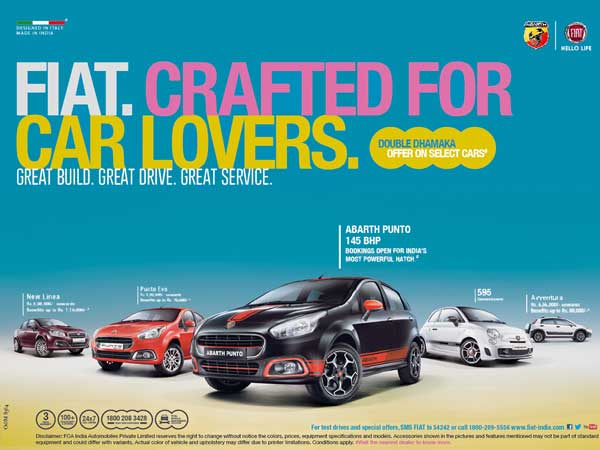 ಇಟಲಿ ಮೂಲದ ಐಕಾನಿಕ್ ಸಂಸ್ಥೆಯಾಗಿರುವ ಫಿಯೆಟ್ ಇಂಡಿಯಾ, ದೇಶದಲ್ಲಿ ಮಾರಾಟದಲ್ಲಿರುವ ತನ್ನೆಲ್ಲ ಶ್ರೇಣಿಯ ಕಾರುಗಳಿಗೆ ಡಬಲ್ ಧಮಾಕಾ ಸೇರಿದಂತೆ ಗರಿಷ್ಠ ಒಂದು ಲಕ್ಷ ರು.ಗಳ ವರೆಗಿನ ಪ್ರಯೋಜನವನ್ನು ಮುಂದಿಟ್ಟಿದೆ.