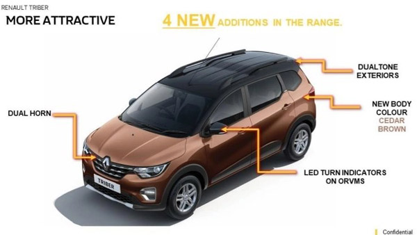 2021ರ ಟ್ರೈಬರ್ ಮಾದರಿಯಲ್ಲಿ ರೆನಾಲ್ಟ್ ಕಂಪನಿಯು ನಾಲ್ಕು ಬಣ್ಣಗಳ ಡ್ಯುಯಲ್ ಟೋನ್ ಬಣ್ಣಗಳ ಆಯ್ಕೆಯೊಂದಿಗೆ ಡ್ಯುಯಲ್ ಹಾರ್ನ್, ರಿಯರ್ ವ್ಯೂ ಮಿರರ್ ಒಳಗೊಂಡ ಎಲ್ಇಡಿ ಟರ್ನ್ ಇಂಡಿಕೇಟರ್ ಮತ್ತು ಬ್ಲ್ಯಾಕ್ ಔಟ್ ಥೀಮ್ ನೀಡಿರುವುದು ಹೊಸ ಕಾರಿಗೆ ಮತ್ತಷ್ಟು ಸ್ಪೋರ್ಟಿ ಲುಕ್ ನೀಡಿದೆ.