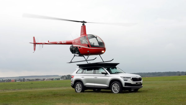 ಹೊಸ SKoda Kodiaq ಎಸ್ಯುವಿ ರೂಫ್ ಮೇಲೆ ಲ್ಯಾಂಡ್ ಆದ ಮಿನಿ ಹೆಲಿಕಾಪ್ಟರ್