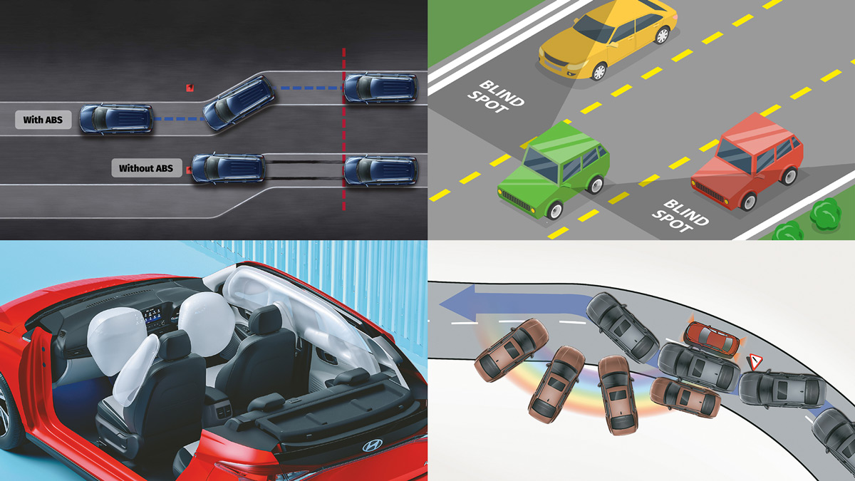 ಏರ್ಬ್ಯಾಗ್ಗಳು: ಏರ್ಬ್ಯಾಗ್ಗಳು ಅಪಘಾತದ ಸಮಯದಲ್ಲಿ ವಾಹನದ ಒಳಭಾಗಕ್ಕೆ ಆಗುವ ಹಾನಿಯ ಸಾಧ್ಯತೆಯನ್ನು ಕಡಿಮೆ ಮಾಡುವುದರಿಂದ ಪ್ರತಿ ಕಾರು ಒಳಗೊಂಡಿರಬೇಕಾದ ಪ್ರಮುಖ ಸುರಕ್ಷತಾ ವೈಶಿಷ್ಟ್ಯವಾಗಿದೆ. ಡ್ಯುಯಲ್ ಫ್ರಂಟ್ ಏರ್ಬ್ಯಾಗ್ಗಳು ಕಾರಿನಲ್ಲಿ ಇರಬೇಕಾದರೆ, ಕನಿಷ್ಠ ಆರು ಏರ್ಬ್ಯಾಗ್ಗಳನ್ನು ಹೊಂದಿರುವ ಮಾದರಿಯನ್ನು ಖರೀದಿಸಬೇಕು. ಏರ್ಬ್ಯಾಗ್ಗಳು ಸೀಟ್ಬೆಲ್ಟ್ಗಳನ್ನು ಧರಿಸಿದಾಗ ಮಾತ್ರ ತೆರೆದುಕೊಲ್ಳುತ್ತವೆ ಎಂಬುದನ್ನು ಕಂಡಿತ ತಿಳಿದಿರಬೇಕು.