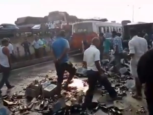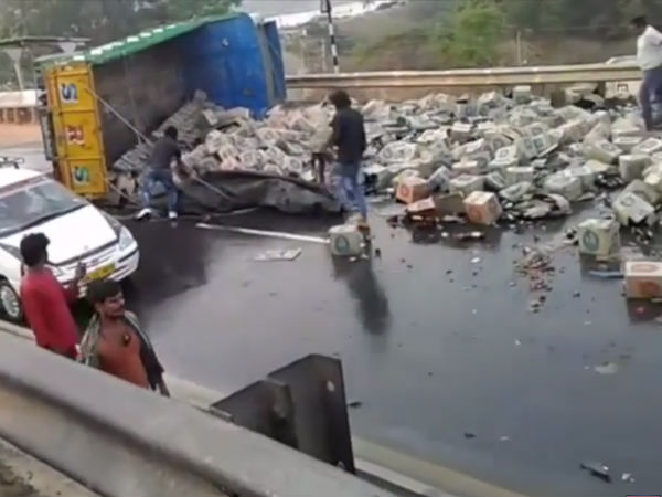 ಏನಪ್ಪಾ, ಏನ್ ಏನೋ ಹೇಳ್ತ ಇದ್ದಾರೆ, ಅನ್ಕೊಂಡ್ರಾ !! ಮುಂದೆ ಓದಿ ನಿಮಗೇ ಎಲ್ಲ ತಿಳಿಯುತ್ತೆ. ರಾಷ್ಟ್ರೀಯ ಹೆದ್ದಾರಿಯಲ್ಲಿ ಸಂಭವಿಸಿದ ಅಪಘಾತದಲ್ಲಿ ಬಿಯರ್ ಲಾರಿಯಿಂದ ಕೆಳಗೆಬಿದ್ದ ಬಿಯರ್ ಬಾಟಲ್`ಗಳನ್ನ ಆಯ್ದುಕೊಳ್ಳಲು ಜನ ಮುಗಿಬಿದ್ದ ಘಟನೆ ತುಮಕೂರಿನ ಕ್ಯಾತ್ಸಂದ್ರ ಬಳಿ ನಂದಿಹಳ್ಳಿ ಬಳಿ ನಡೆದಿದೆ.