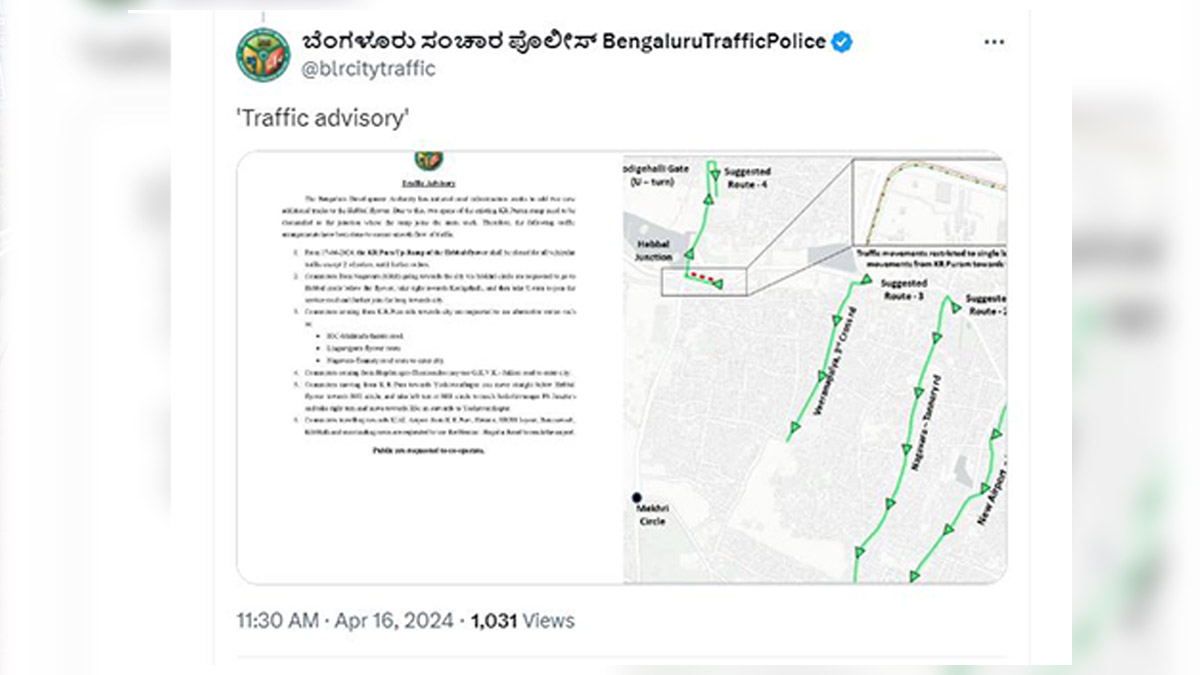 ಏ.17ರಿಂದ ನಾಗವಾರದಿಂದ ಹೆಬ್ಬಾಳ ಮೇಲ್ಸೇತುವೆ ಕಡೆಗೆ ಬರುವ ದ್ವಿಚಕ್ರ ವಾಹನ ಹೊರತುಪಡಿಸಿ, ಉಳಿದೆಲ್ಲ ವಾಹನಗಳ ಸಂಚಾರವನ್ನು ಕೆಆರ್ ಪುರಂ ಅಪ್-ರ್ಯಾಂಪ್ ಮೇಲೆ ನಿರ್ಬಂಧಿಸಲಾಗಿದೆ. ನಾಗವಾರದಿಂದ (ಔಟರ್ ರಿಂಗ್ರೋಡ್) ನಗರದೊಳಗೆ ಮೇಖ್ರಿ ಸರ್ಕಲ್ ಮೂಲಕ ಬರುತ್ತಿದ್ದ ವಾಹನಗಳು, ಹೆಬ್ಬಾಳ ವೃತ್ತದಲ್ಲಿ ಮೇಲ್ಸೇತುವೆ ಕೆಳಗಿನಿಂದ ಬಲಕ್ಕೆ ತಿರುಗಿ, ಕೊಡಿಗೆಹಳ್ಳಿ ಜಂಕ್ಷನ್ ಬಳಿಯು ತಿರುವು ಪಡೆದು ಸರ್ವಿಸ್ ರಸ್ತೆಯಿಂದ ಹೆಬ್ಬಾಳ ಮೇಲ್ಸೇತುವೆಯ ರ್ಯಾಂಪ್ ಮೂಲಕ ನಗರದ ಕಡೆಗೆ ಚಲಿಸಬೇಕು.