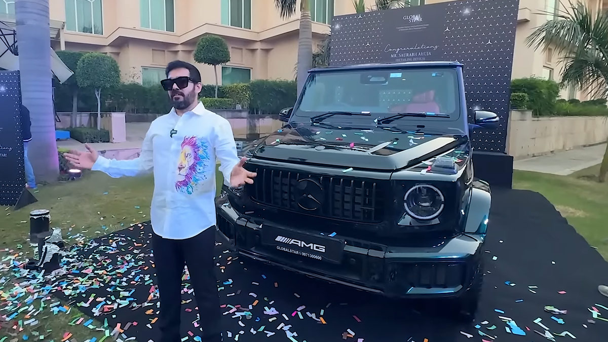 ಡಿಟೈಲಿಂಗ್ ಡೆವಿಲ್ ಎಂಬ ಕಾರ್ ಡಿಟೇಲಿಂಗ್ ಬ್ರ್ಯಾಂಡ್ ಮಾಲೀಕ ಸೌರಭ್ ಅಹುಜಾ ಎರಡು ದಿನಗಳ ಅಂತರದಲ್ಲಿ ಐಷಾರಾಮಿ ಕಾರುಗಳನ್ನು ಖರೀದಿಸಿದ್ದಾರೆ. ಕಳೆದ ತಿಂಗಳು 6 ಕೋಟಿ ಮೌಲ್ಯದ ಮೆಕ್ಲಾರೆನ್ ಆರ್ಟುರಾ ಸೂಪರ್ ಕಾರನ್ನು ಖರೀದಿಸಿದ್ದ ಸೌರಭ್ ಇದೀಗ ಮರ್ಸಿಡಿಸ್ ಬೆಂಝ್ G63 ಎಎಂಜಿ (Mercedes-Benz G 63 AMG) ಎಸ್ಯುವಿಯನ್ನು ಖರೀದಿಸಿದ್ದಾರೆ. ಜಿ-ವ್ಯಾಗನ್ ಎಂದು ಕರೆಯಲ್ಪಡುವ ವಿಶ್ವವಿಖ್ಯಾತ ಸ್ಪೋರ್ಟ್ಸ್ ಯುಟಿಲಿಟಿ ವೈಕಲ್ ಉದ್ಯಮಿಯ ಮನೆಗೆ ಎತಲುಪಿದೆ.