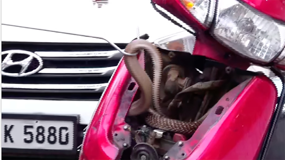 ಕೇರಳದಲ್ಲಿ ಘಟನೆ ನಡೆದಿದ್ದು, ಹೋಂಡಾ ಆಕ್ಟಿವಾವನ್ನು ಮನೆಯ ಹೊರಗೆ ನಿಲ್ಲಿಸಿದ್ದಾಗ ಹಾವು ಸ್ಕೂಟರ್ನಲ್ಲಿ ಸೇರಿಕೊಂಡಿದೆ ಎಂದು ತಿಳಿದುಬಂದಿದೆ. ಸ್ಕೂಟರ್ ಮುಂಭಾಗದ ಶೀಲ್ಡ್ ಕವರ್ನಿಂದ ಬಾಲ ಅಂಟಿಕೊಂಡಿರುವುದನ್ನು ಗಮನಿಸಿದ ಸ್ಕೂಟರ್ ಮಾಲೀಕರು ಹಾವು ಇದೆಯೆಂದು ಅರಿತುಕೊಂಡಿದ್ದಾರೆ. ಹೀಗೆ ಬಿಟ್ಟರೆ ಅಪಾಯ ಖಚಿತವೆಂದುಕೊಂಡ ಅವರು ಶೀಘ್ರ ಪರಿಣಿತ ಸರ್ಪ ರಕ್ಷಕರನ್ನು ಕರೆತಂದಿದ್ದಾರೆ.