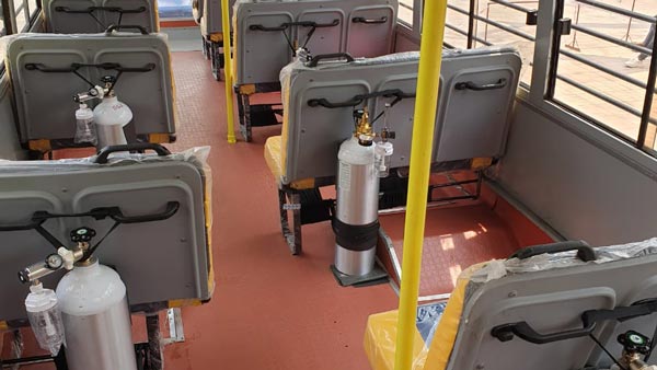 ಸಾರ್ವಜನಿಕ ಬಸ್ಗಳನ್ನು ತಾತ್ಕಾಲಿಕವಾಗಿ ಆಕ್ಸಿಜನ್ ಕೇಂದ್ರಗಳಾಗಿ ಪರಿವರ್ತಿಸಲಾಗಿದೆ. ಪ್ರತಿ ಸೀಟುಗಳ ನಡುವಿನ ಸೀಟುಗಳನ್ನು ತೆಗೆದುಹಾಕಿ ಅವುಗಳ ಹಿಂಭಾಗದಲ್ಲಿ ಆಕ್ಸಿಜನ್ ಸಿಲಿಂಡರ್ಗಳನ್ನು ಅಳವಡಿಸಲಾಗಿದೆ.