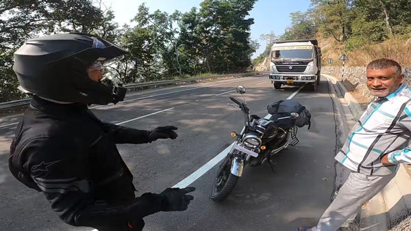 ಅಭಿನವ್ ಭಟ್ ಅವರಿಗೆ ಏನಾಗುತ್ತಿದೆ ಎಂದು ಅರ್ಥವಾಗಿಲ್ಲ. ಟ್ರಕ್ ಚಾಲಕ ಕೆಳಗಿಳಿದು ಬಂದಾಗ ಅವರ ಅನುಮಾನ, ಗೊಂದಲಗಳು ಬಗೆಹರಿದಿವೆ. ಹೋಂಡಾ ಹೈನೆಸ್ ಸಿಬಿ 350 ಬೈಕ್ ಅನ್ನು ಹತ್ತಿರದಿಂದ ನೋಡಲು ಹಾಗೂ ಆ ಬೈಕಿನ ಬಗ್ಗೆ ತಿಳಿದುಕೊಳ್ಳಲು ಲಾರಿ ಚಾಲಕ ಅವರನ್ನು ಹಿಂಬಾಲಿಸಿಕೊಂಡು ಬಂದಿದ್ದಾನೆ.
