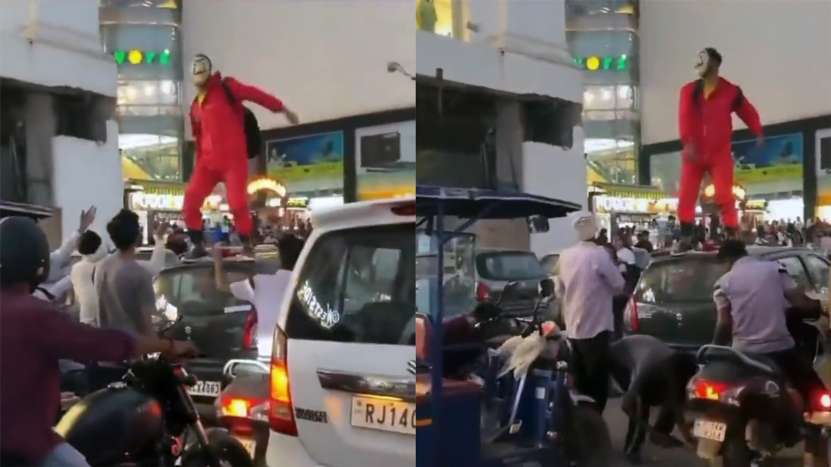 ಜನಪ್ರಿಯ ನೆಟ್ಫ್ಲಿಕ್ಸ್ ವೆಬ್ ಸಿರೀಸ್ನಲ್ಲಿ ಸಾಕಷ್ಟು ಜನಪ್ರಿಯತೆ ಪಡೆದುಕೊಂಡಿದ್ದ ಆಂಗ್ಲ ಭಾಷೆಯ 'ಮನಿ ಹೈಸ್ಟ್' (Money Heist) ಪಾತ್ರವೊಂದರ ಉಡುಗೆಯನ್ನು ತೊಟ್ಟು ಹಣ ಎಸೆದ ವೀಡಿಯೊ ಸೋಶಿಯಲ್ ಮೀಡಿಯಾಗಳಲ್ಲಿ ಭಾರೀ ವೈರಲ್ ಆಗಿದೆ. ಈ ಘಟನೆಯು ರಾಜಸ್ಥಾನದ ಜೈಪುರದಲ್ಲಿ ನಡೆದಿದೆ. ಈ ವೀಡಿಯೊ X (ಹಿಂದೆ Twitter) ಆನ್ಲೈನ್ನಲ್ಲಿ ಬಳಕೆದಾರರು ವೀಡಿಯೊವನ್ನು ಹಂಚಿಕೊಂಡಿದ್ದಾರೆ. ಹಣ ಎಸೆದ ವ್ಯಕ್ತಿಯು ದೀಗ ಪೊಲೀಸರ ಅತಿಥಿಯಾಗಿದ್ದಾನೆ.