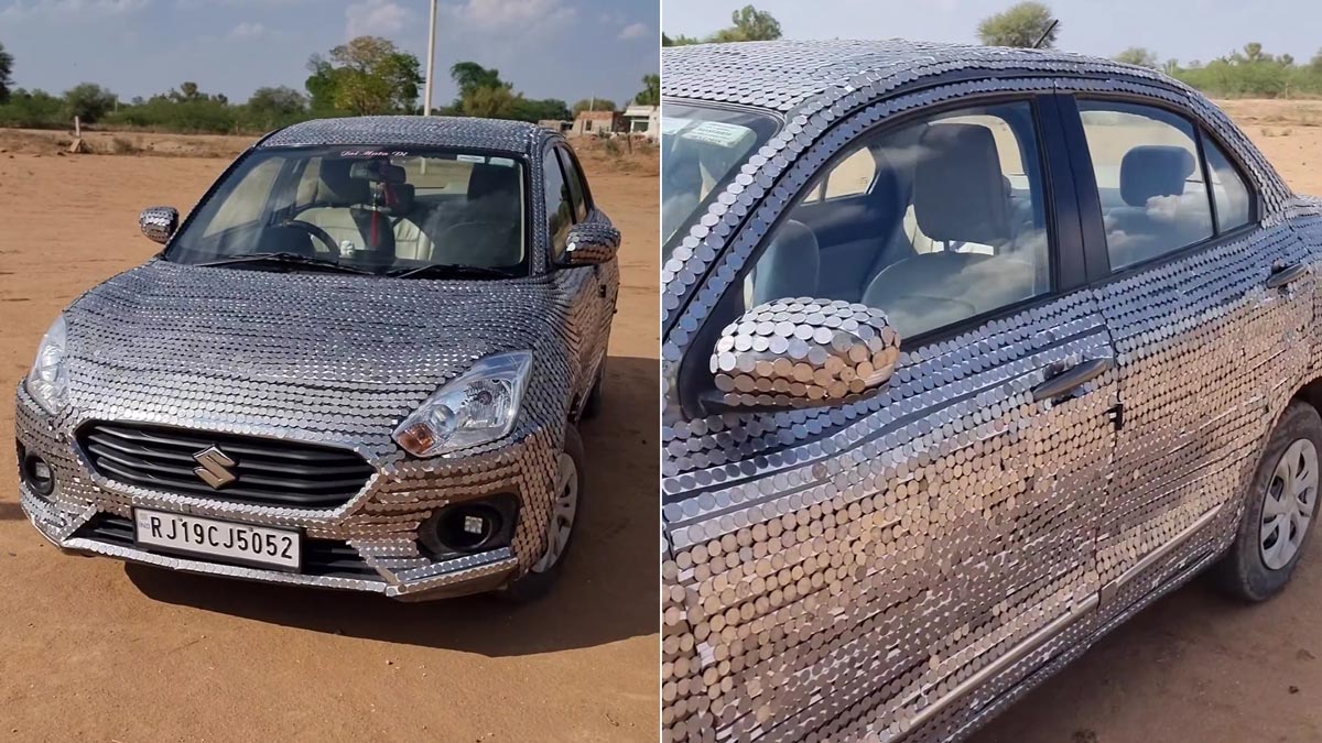 ಲೋಹದ ನಾಣ್ಯಗಳಿಂದ ಅಲಂಕರಿಸಿದ ಮಾರುತಿ ಸ್ವಿಫ್ಟ್ ಡಿಜೈರ್ ಕಾರು ನೆಟ್ಟಿಗರ ಗಮನಸೆಳೆದಿದೆ, ಕಾರಿನ ಬಣ್ಣದ ಮೇಲೆ ನಾಣ್ಯಗಳನ್ನು ಅಂಟಿಸುವುದು ಸವಾಲಿನ ಕೆಲಸವಾಗಿದ್ದು ಅದು ತಾಳ್ಮೆ, ನಿಖರತೆ ಮತ್ತು ಕಾಳಜಿಯ ಅಗತ್ಯವಿರುತ್ತದೆ. ಒಂದು ವೇಳೆ ಆ ನಾಣ್ಯಗಳನ್ನು ಯಾರದರೂ ತೆಗೆದುಹಾಕಿದರೆ, ಅದು ಕಾರಿನ ಬಣ್ಣಗಳನ್ನು ಹಾನಿಗೊಳಿಸುತ್ತದೆ. ಈ ಕಾರಿನ ಮಾಲೀಕರು ಪ್ರತಿ ನಾಣ್ಯವನ್ನು ಅಚ್ಚುಕಟ್ಟಾಗಿ ಸ್ಥಳದಲ್ಲಿ ಅಂಟಿಸುವಾಗ ಹೆಚ್ಚಿನ ಕಾಳಜಿ ವಹಿಸಿರಬೇಕು.