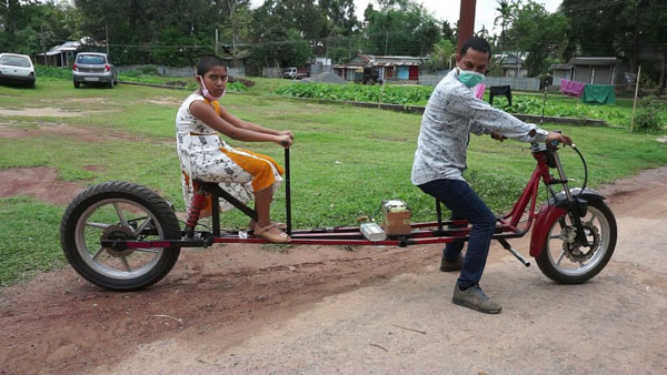 ವಿಭಿನ್ನವಾದ ಬೈಕ್ ಅನ್ನು ವಿನ್ಯಾಸಗೊಳಿಸುವ ಮೂಲಕ ಈ ಸಮಸ್ಯೆಗೆ ಪರಿಹಾರ ಕಂಡುಕೊಂಡಿದ್ದಾರೆ. ಈ ಬೈಕ್ನಲ್ಲಿ ಸಾಮಾಜಿಕ ಅಂತರವನ್ನು ಪಾಲಿಸುವ ಮೂಲಕ ತಮ್ಮ ಮಗಳನ್ನು ಶಾಲೆಗೆ ಕರೆದೊಯ್ಯುತ್ತಿದ್ದಾರೆ. ಈ ಬೈಕಿನಲ್ಲಿ ಇಬ್ಬರು ಕುಳಿತು ಕೊಳ್ಳಬಹುದು. ಎರಡು ಸೀಟುಗಳ ಮಧ್ಯೆ ಒಂದು ಮೀಟರ್ ಅಂತರವನ್ನು ಇಡಲಾಗಿದೆ.