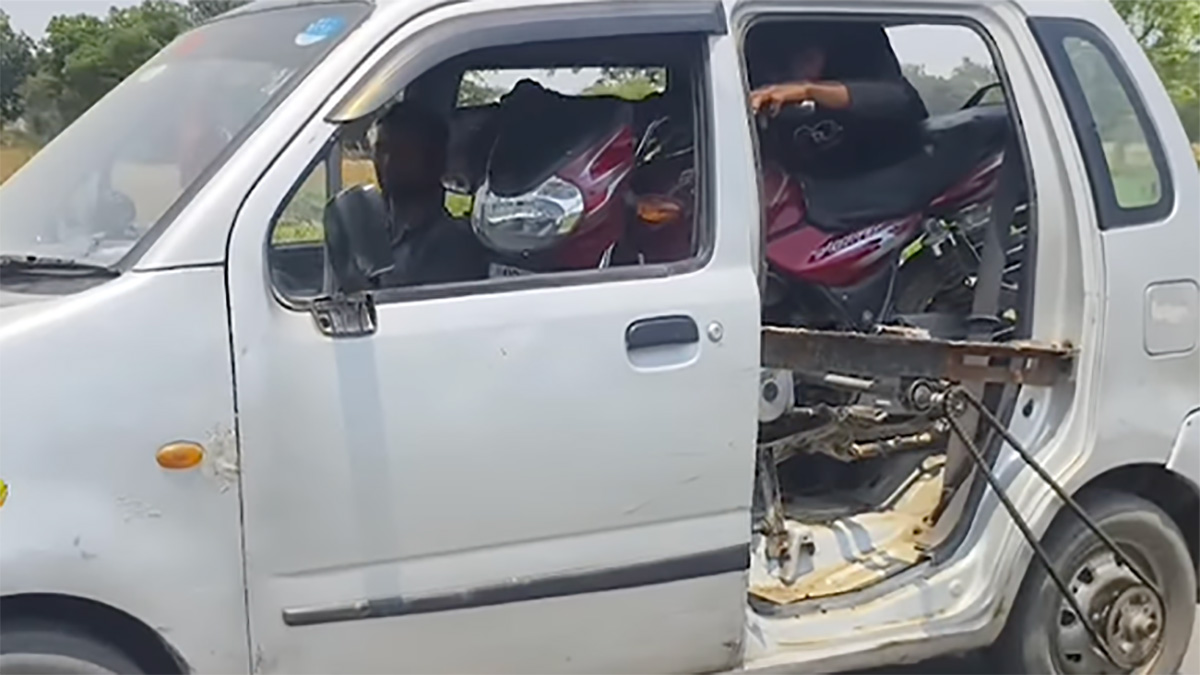 ನಾವು ಭಾರತೀಯರು ವಿನೂತನ ಆವಿಷ್ಕಾರಗಳಿಗೆ ಹೆಸರುವಾಸಿ. ನಮ್ಮಲ್ಲಿರುವ ವಸ್ತುಗಳನ್ನು ಮಾತ್ರ ಬಳಸಿಕೊಂಡು ವಿಶಿಷ್ಟ ಉತ್ಪನ್ನವನ್ನು ತಯಾರಿಸುತ್ತೇವೆ. ಇದೇ ರೀತಿ ಇಲ್ಲಿ ವ್ಯಾಗನ್ಆರ್ ಕಾರೊಂದು ಬೈಕ್ನಿಂದ ಚಾಲಿತವಾಗಿದೆ. ಮಾಲೀಕರು ಬೈಕ್ ಅನ್ನು ಮಾರುತಿ ಸುಜುಕಿ ವ್ಯಾಗನ್ಆರ್ ಕಾರಿನ ಹಿಂಭಾಗದಲ್ಲಿ ಇರಿಸಲಾಗಿದೆ.ಇದಕ್ಕಾಗಿ ಕಾರಿನ ಹಿಂದಿನ ಸೀಟುಗಳನ್ನು ತೆಗೆದು ಹಾಕಿದ್ದಾರೆ