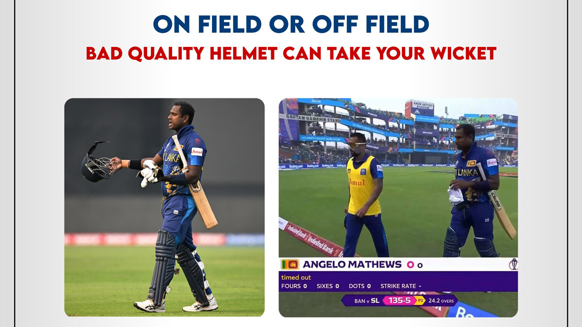 ಕೆಟ್ಟ ಹೆಲ್ಮೆಟ್ನಿಂದ ನಿಮ್ಮ ವಿಕೆಟ್ ಉರುಳಬಹುದು: ಮ್ಯಾಥ್ಯೂಸ್ ಉದಾಹರಣೆಯಾಗಿಸಿ ಹೆಲ್ಮೆಟ್ ಕುರಿತು ಜಾಗೃತಿ