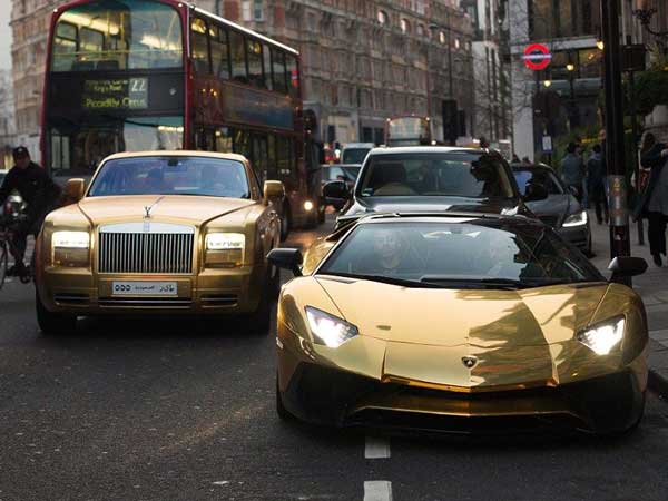 ಸೌದಿ ಅರೇಬಿಯಾದ ಕೋಟ್ಯಧಿಪತಿ ಉದ್ಯಮಿಯೊಬ್ಬರು ಚಿನ್ನ ಲೇಪಿತ ಕಾರುಗಳೊಂದಿಗೆ ಲಂಡನ್ನಿಗೆ ಸೌದಿ ಇಂದ ಬಂದಿಳಿದಿದ್ದಾರೆ.