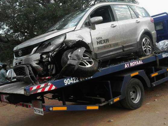ಕಳೆದ ತಿಂಗಳು ಬಿಡುಗಡೆಗೊಂಡ ಟಾಟಾ ಮೋಟರ್ಸ್ ನ ಹೆಕ್ಸಾ ಕಾರು 100 ಕಿಲೋಮೀಟರ್ ವೇಗದಲ್ಲಿ ಹೋಗುವಾಗ ಕೊಯಂಬತ್ತೂರ್ ನಲ್ಲಿ ಅಪಘಾತಕ್ಕೀಡಾಗಿದೆ.