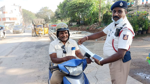 ಬೆಂಗಳೂರಿನಲ್ಲಿ ಎಲ್ಲರಿಗೂ ಒಂದೇ ನ್ಯಾಯ: ಹಾಫ್ ಹೆಲ್ಮೆಟ್ ಧರಿಸಿದ ಪೊಲೀಸ್ಗೆ ಬಿತ್ತು ದಂಡ