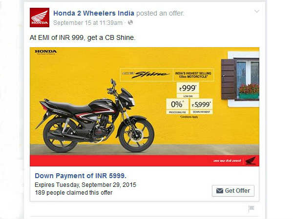 ಆಸಕ್ತ ಗ್ರಾಹಕರು ಹೋಂಡಾ ಟು ವೀಲರ್ಸ್ ಅಧಿಕೃತ ಫೇಸ್ ಬುಕ್ ಪುಟಕ್ಕೆ ತೆರಳಿ ಅಲ್ಲಿ ಕೊಟ್ಟಿರುವ (https://www.facebook.com/honda2wheelers.in/) ಸಿಬಿ ಶೈನ್ ಆಫರ್ (Get Offer) ಕ್ಲಿಕ್ ಮಾಡಿದರೆ ಸಾಕು. ನಿಮ್ಮ ಇನ್ ಬಾಕ್ಸ್ ಗೆ ಆಫರ್ ಮೇಲ್ ಬಂದು ಸೇರಲಿದೆ. ಬಳಿಕ ಇದನ್ನು ನಿಮ್ಮ ಹತ್ತಿರ ಹೋಂಡಾ ಶೋ ರೂಂಗಳಿಗೆ ತೆರಳಿ ತೋರಿಸಿದಾಯಿತು. ಇನ್ಯಾಕೆ ತಡ ಈಗಲೇ ಆಫರ್ ನಿಮ್ಮದಾಗಿಸಿ!