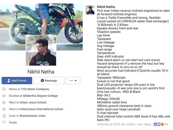 ಟಿವಿಎಸ್ ಕಂಪನಿಯ ಉದ್ಯೋಗಿಯಿಂದ ಅಪಾಚೆ ಆರ್ಆರ್ 310 ಬೈಕಿನ ರಹಸ್ಯ ಚಿತ್ರ ಬಿಡುಗಡೆ