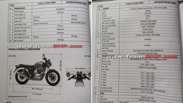 ಬಹಿರಂಗಗೊಂಡ ರಾಯಲ್ ಎನ್ಫೀಲ್ಡ್ 650 ಟ್ವಿನ್ ಬೈಕ್ಗಳ ಮ್ಯಾನುವಲ್ನಲ್ಲಿ, ಇಂಟರ್ಸೆಪ್ಟರ್ 650 ಬೈಕ್ 202 ಕೆಜಿ ತೂಕ ಮತ್ತು ಕಾಂಟಿನೆಂಟಲ್ ಜಿಟಿ ಬೈಕ್ 198 ಕೆಜಿ ತೂಕವನ್ನು ಪಡೆದುಕೊಂಡಿರಲಿದೆ. ಇಂಟರ್ಸೆಪ್ಟರ್ 650 13.7 ಲೀಟರ್ ಫ್ಯುಯಲ್ ಟ್ಯಾಂಕ್ ಅನ್ನು ಪಡೆದುಕೊಂಡಿರಲಿದ್ದು, ಇನ್ನು ಕಾಂಟಿನೆಂಟಲ್ ಜಿಟಿ 650 ಬೈಕ್ 12.5 ಲೀಟರ್ನ ಫ್ಯುಯಲ್ ಟ್ಯಾಂಕ್ ಅನ್ನು ಪಡೆದುಕೊಂಡಿರಲಿದೆ.